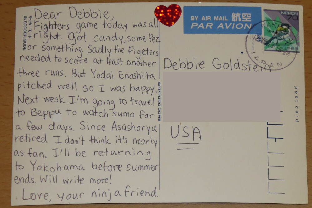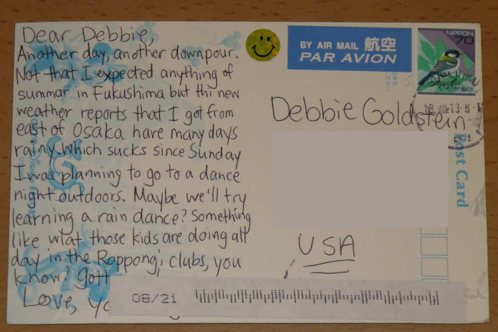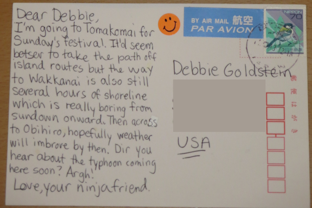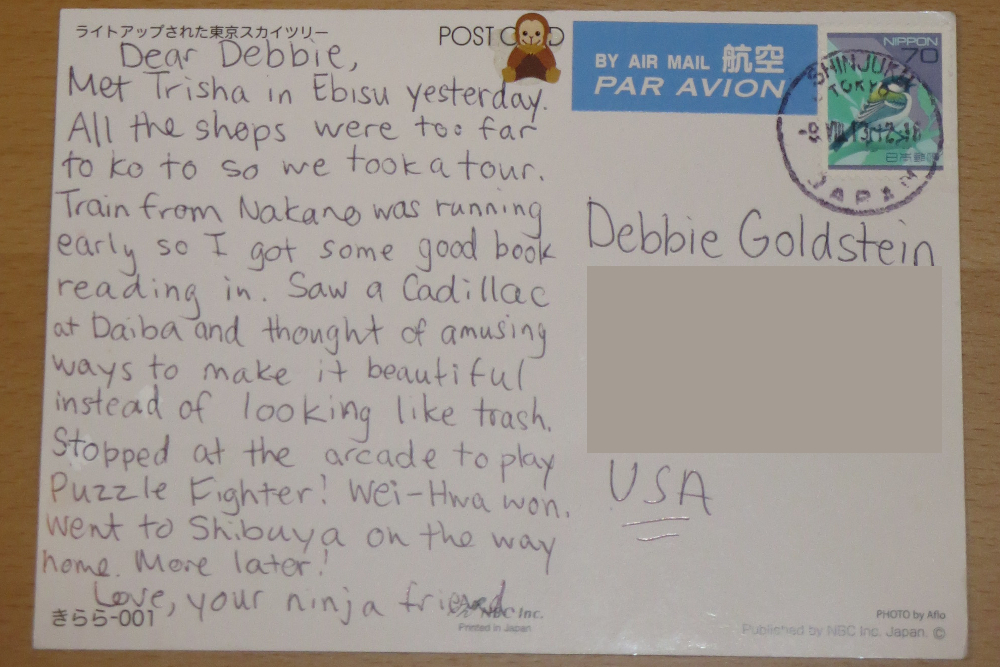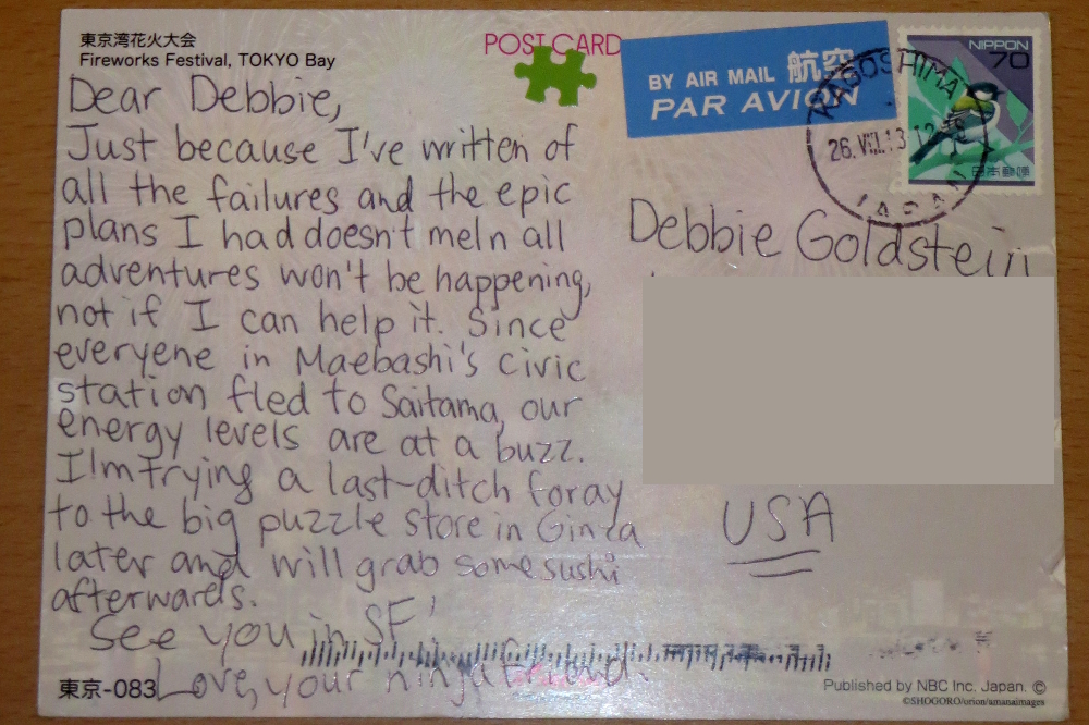 I will say that the address part of the postcard is completely not part of the puzzle, hence why it got blocked out, and the USA doesn't matter either, nor do the stamps or the postmarks, nor anything in the "ninja friend" signature, since I had a feeling that'd get stamped over.